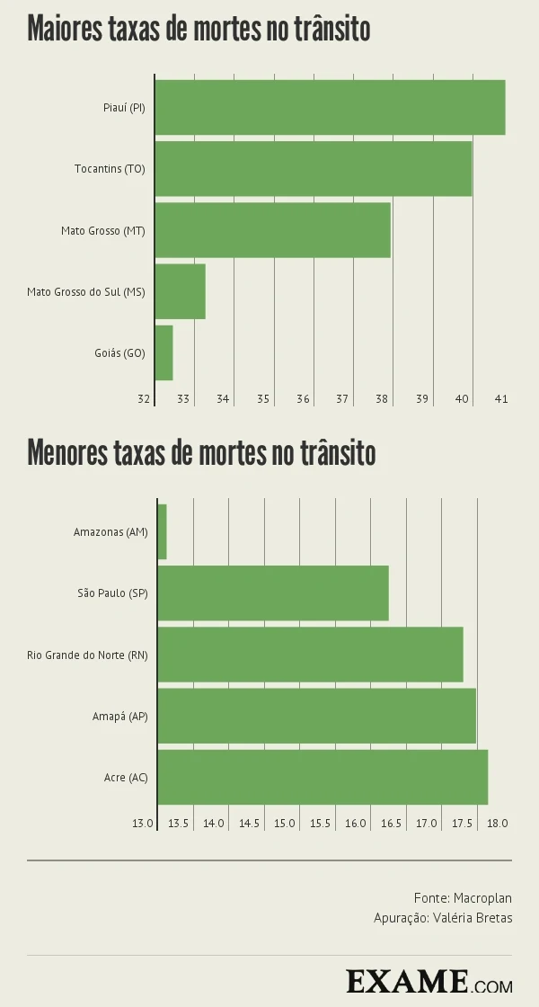 O estado brasileiro que mais se aproxima da referência internacional é o Amazonas, onde a taxa é de 13 a cada grupo de cem mil. Já o Piauí, é o lugar onde a morte no trânsito é mais frequente: 41 óbitos a cada 100 mil piauienses – o dobro da taxa nacional.