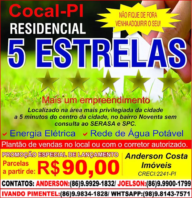 O Grupo Anderson Costa Imóveis está oferecendo a população cocalense um de seus mais recentes empreendimentos: o Residencial 5 ESTRELAS, dotados de excelente infraestrutura com água, energia elétrica e localização privilegiada (Bairro 90), o que garantirá aos compradores forte valorização.