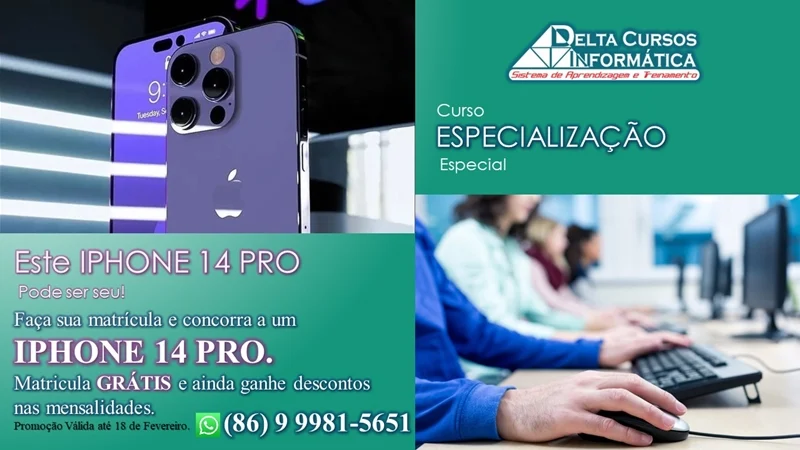 A Delta Cursos Informática, a melhor e mais completa escola de computação de toda região está com inscrições abertas e avisa aos alunos que se matricularem até o dia 18 de fevereiro, que a matricula será gratuita e com direito a participar do sorteio de um iPhone 14 Pro.