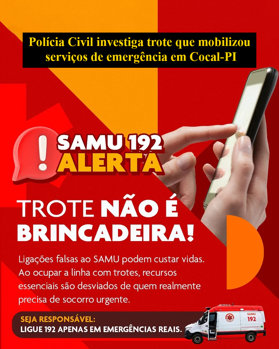 A Polícia Civil vai investigar um trote recebido na manhã deste domingo (10/11) pelo Serviço de Atendimento Móvel de Urgência (Samu), com sede na cidade de Cocal, no Norte do Piauí. A chamada mobilizou equipes do Samu, do Hospital Estadual Joaquim Vieira de Brito e da Polícia Militar, que se deslocaram para atender uma ocorrência inexistente.